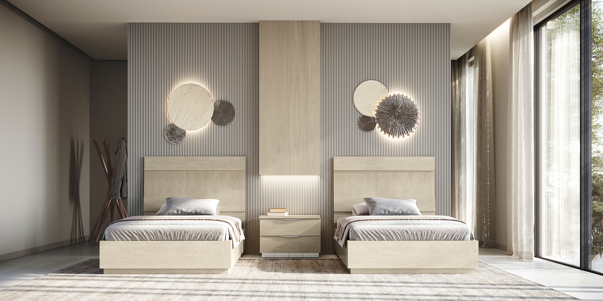 The Kroma 48" Bed by Camelgroup, Italy – A refined and modern choice that blends style with simplicity. Shown here in a 48" twin size, it features a light wood finish with clean, understated lines. The vertical panel design behind the bed adds a touch of elegance, while subtle metallic accents provide a tasteful modern touch. A perfect option for those seeking a contemporary look that remains warm and inviting.