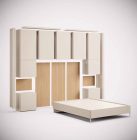 Bedroom proposal featuring a panelled headboard with adjustable upper modules that seamlessly fit into any space.